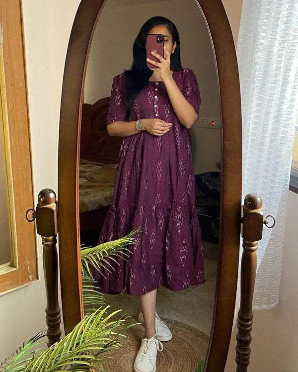 Biba Chic Maroon Ikat Midi Dress With Puff Sleeves